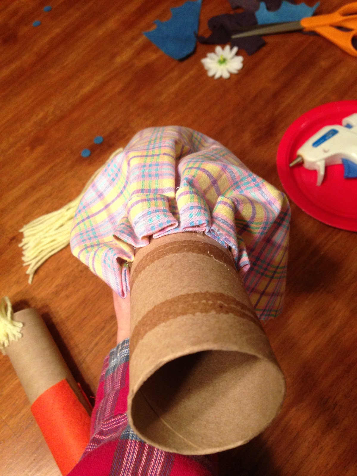 Shortly after Christmas my daughter came to me holding one of the two wrapping paper tubes I kept for the kids, for an undetermined craft project. She asked for fabric and tried desperately to explain her grand idea…putting things here and having a thing on the top and adding something there. Her ideas were pouring out faster than she could grasp the words. I said, “you want to make a doll?” Relieved, she said “yes.” And so we began…