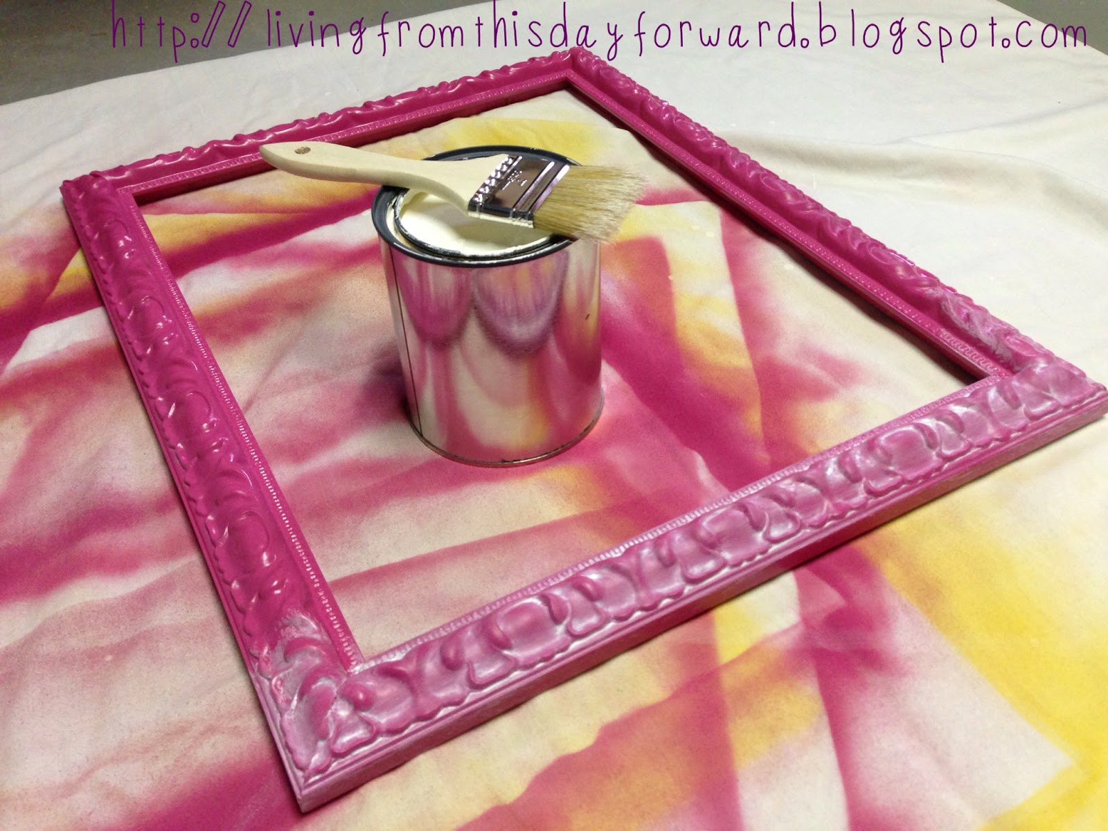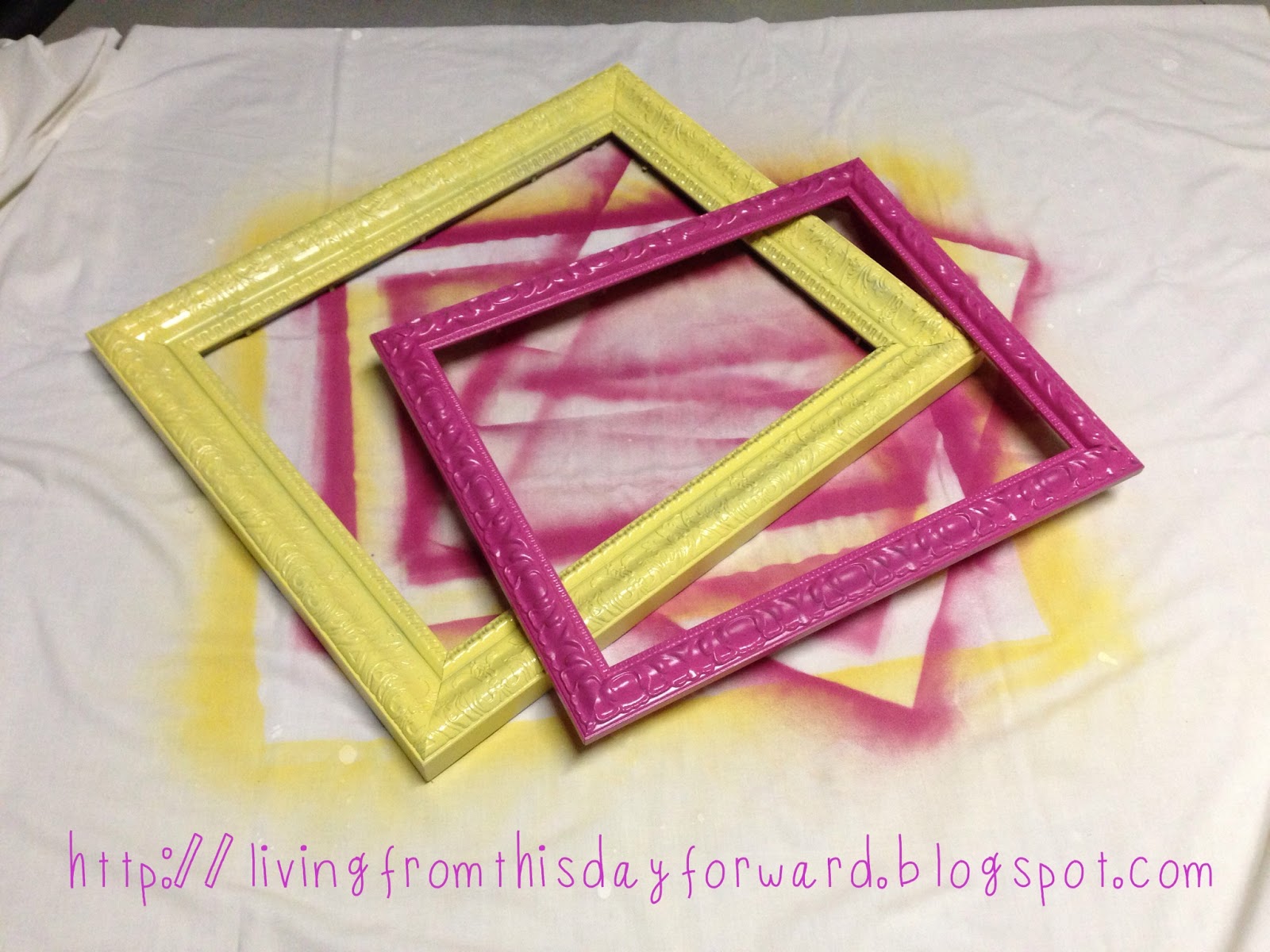 I chose cheery paint colors that coordinate with her bedroom decor. I spray primed the frames first to create a surface ideal for the paint to adhere to. I followed that with two light coats of colorful spray paint – butter yellow and poppy pink. Make sure to follow dry time instructions before moving on to the next step.
