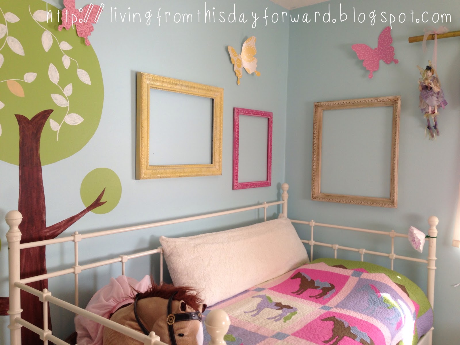 I worked on the frames late at night, after bedtime, in the basement (please use proper ventilation!) in order to keep the project a surprise. I scurried to hang the frames and clean her bedroom (no small feat on the cleaning part) one morning while she was at preschool, in anticipation of the big unveiling.
