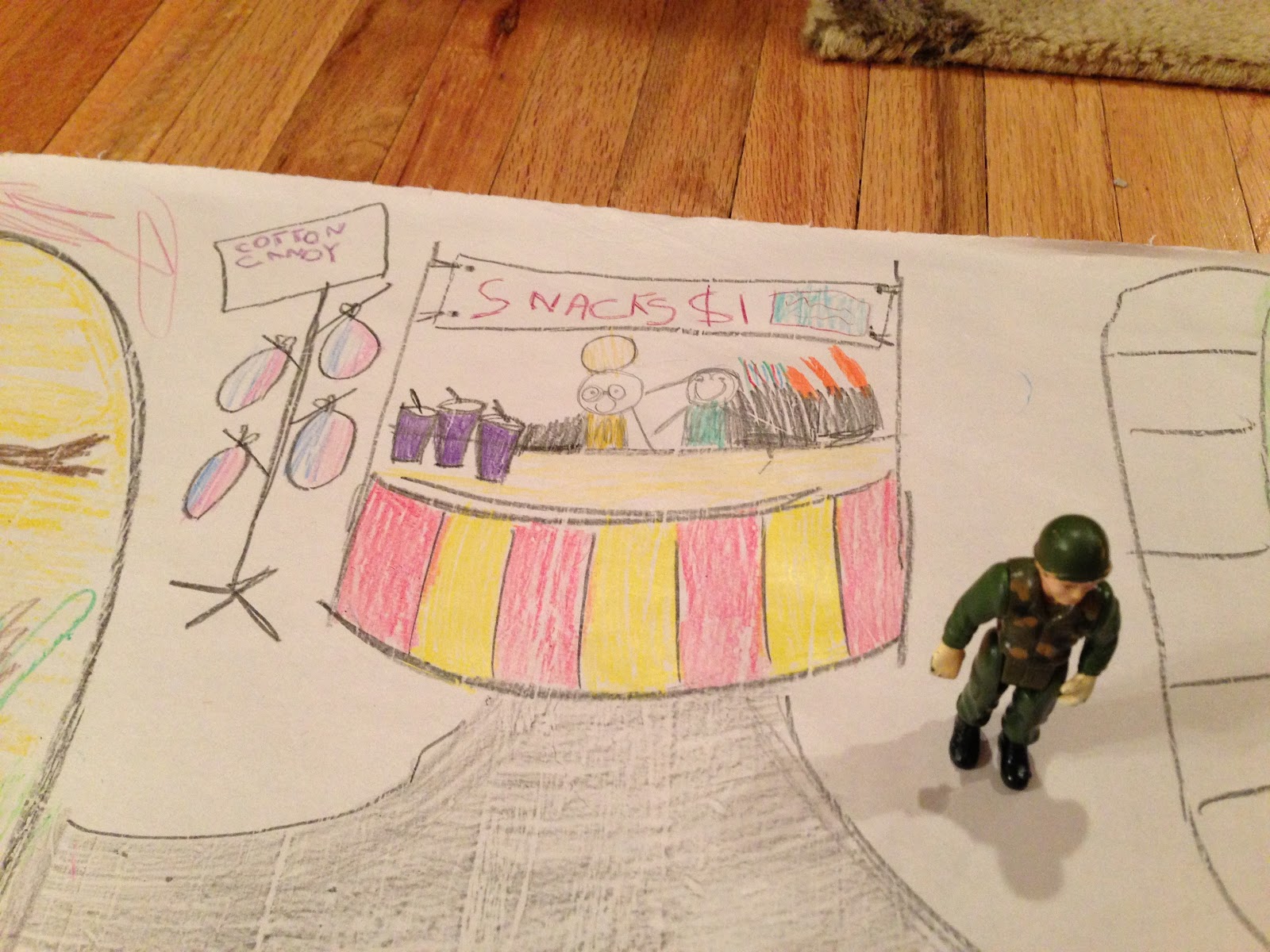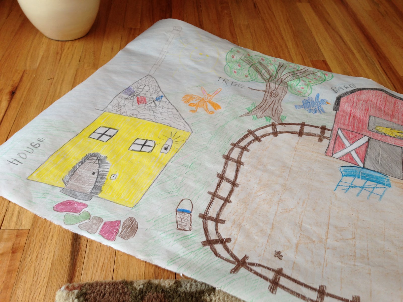 We started this activity years ago, when my little man was obsessed with toy cars. We have a city scroll pictured above. This time we added city streets/raceway, a central park, a farmer’s market, a pond and a neighborhood. Have your babes brainstorm with you – let your imaginations run wild! This scroll was perfect for our toy cars.